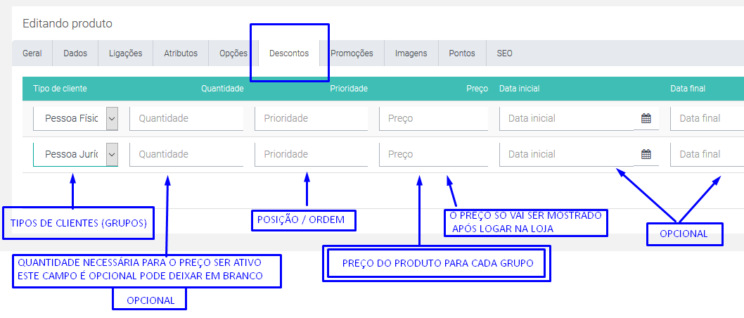 Edite ou cadastre um novo produto normalmente, mas para diferenciar os valores para cada TIPO DE CLIENTE clique na aba DESCONTOS. ( veja o print abaixo ).